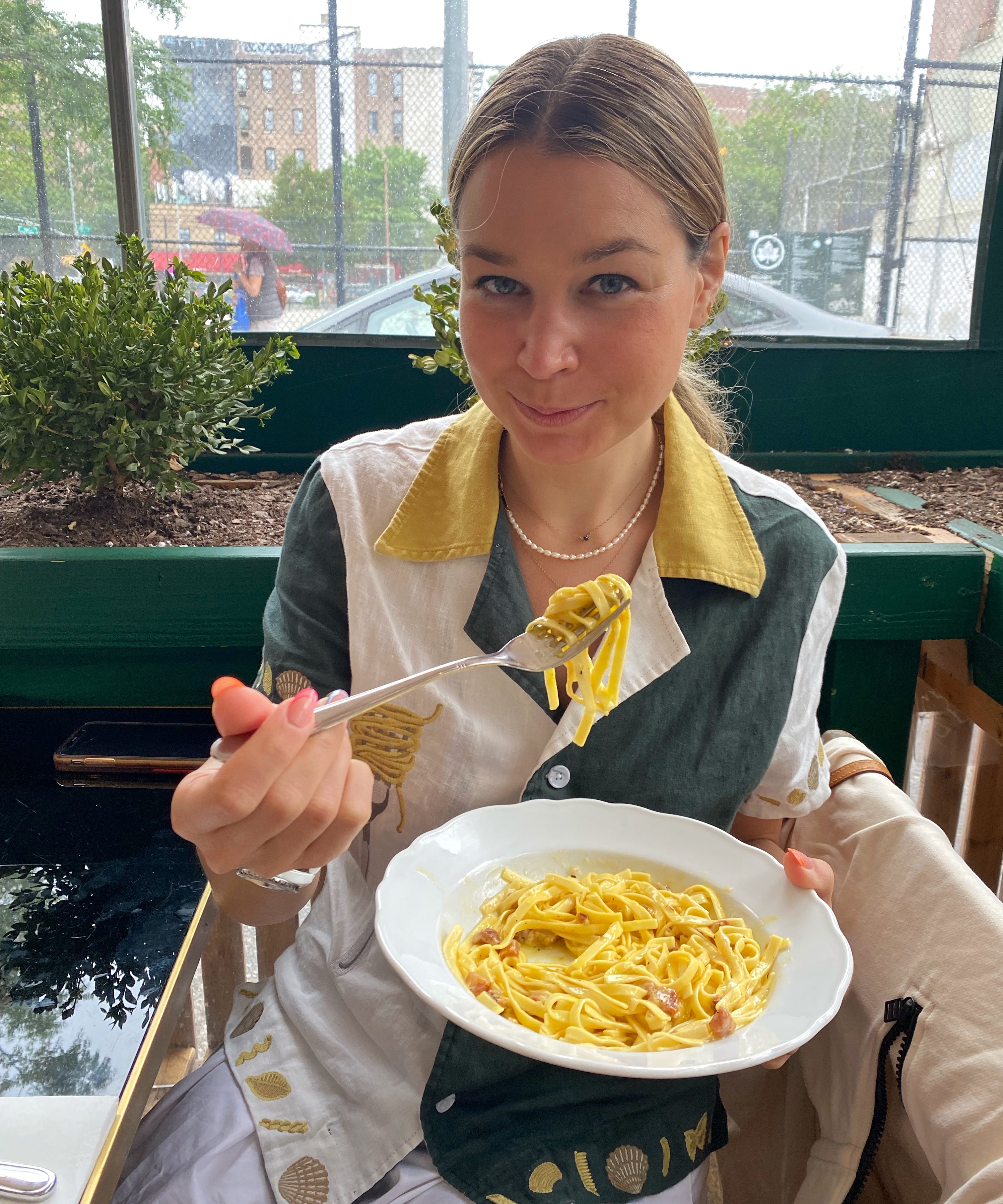 “Last summer, while following stay-at-home orders, I impulse-bought this pasta shirt from Tombolo to wear at home as I canceled all foreseeable vacation plans. Fast-forward a year later, I haven’t left New York, and it’s still my go-to shirt when I need a mood-booster. This month, I am planning on upgrading to a matching set from the brand — one that may actually end up on a trip. I am loving this “Fruits de Mer” one that just launched.” — Irina Grechko, Fashion Director
