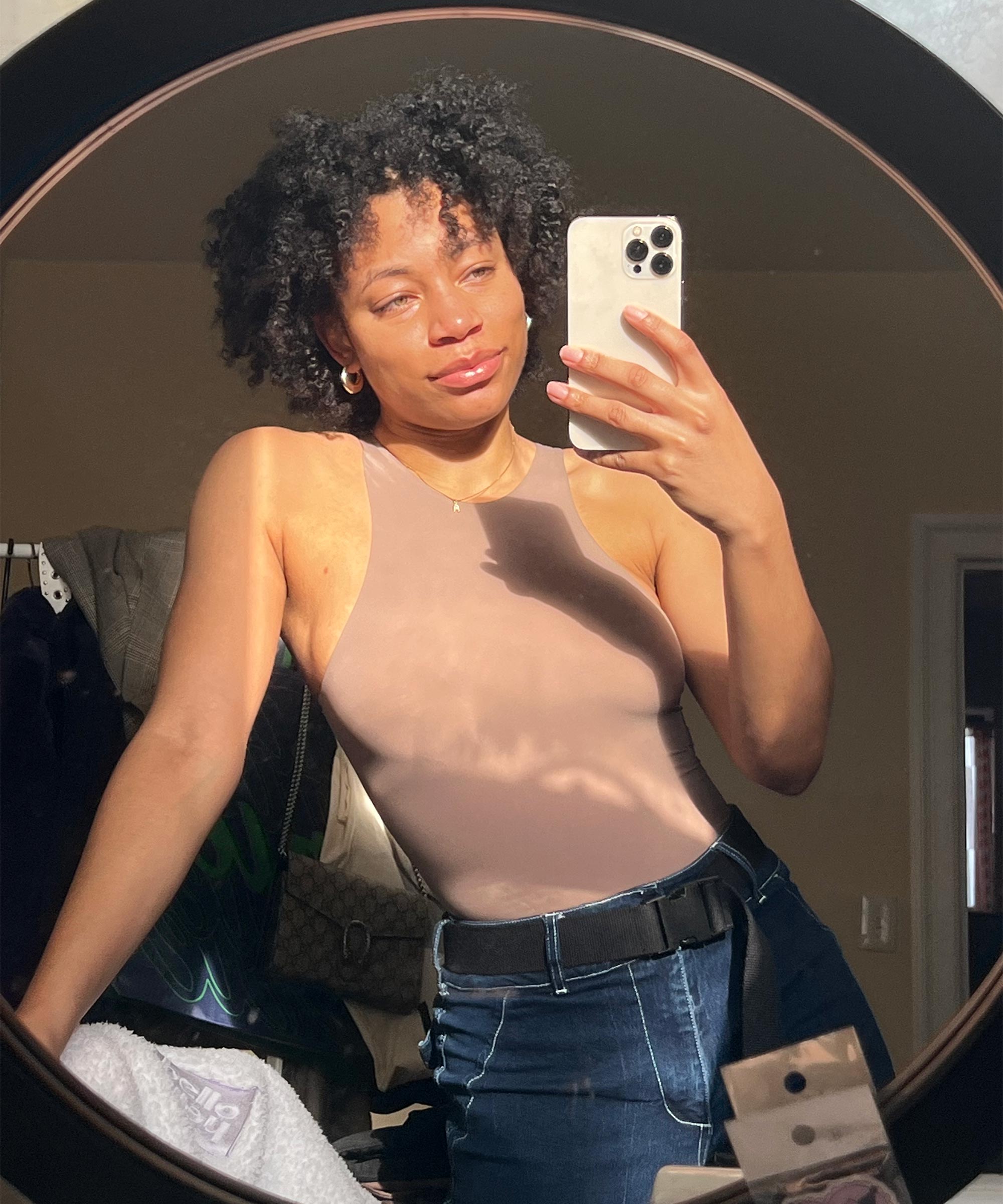 “Kimberly has seriously outdone herself with these bodysuits. I opted for Oxide, which was a gamble but was the perfect mushroom-y brownish greige. Even though I wear a 30D bra, my frame is very petite. I got a bodysuit in an XS, which looked tiny out of the bag but ended up being a perfect fit since it’s super-stretchy. The fabric is insanely soft and buttery to the touch — if you have a significant other, you have been warned that they will not be able to keep their hands off you.
