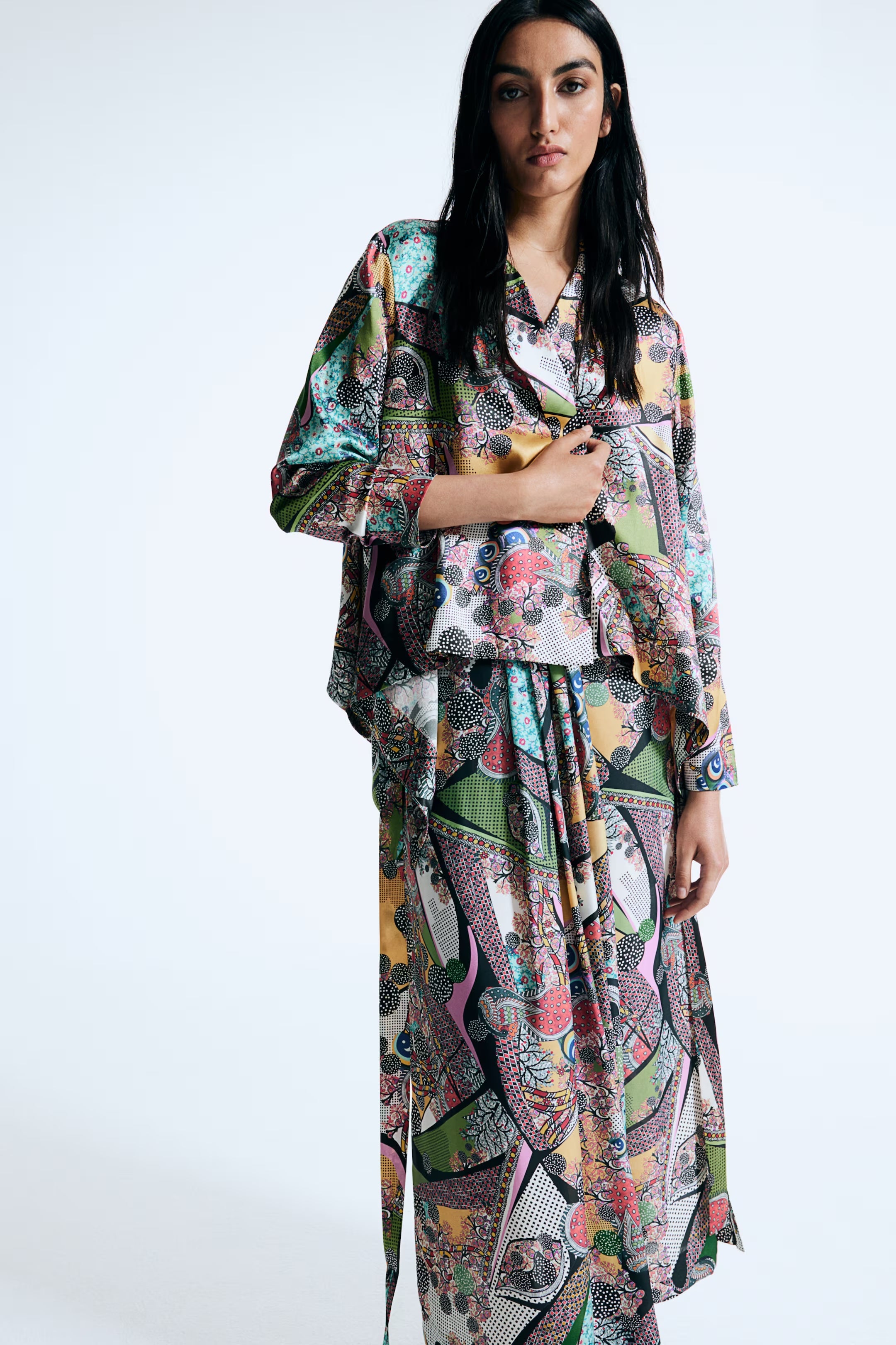 H&M x Anamika Khanna Tie-Belt Abstract-Motif Silk Shirt, $, available at H&M