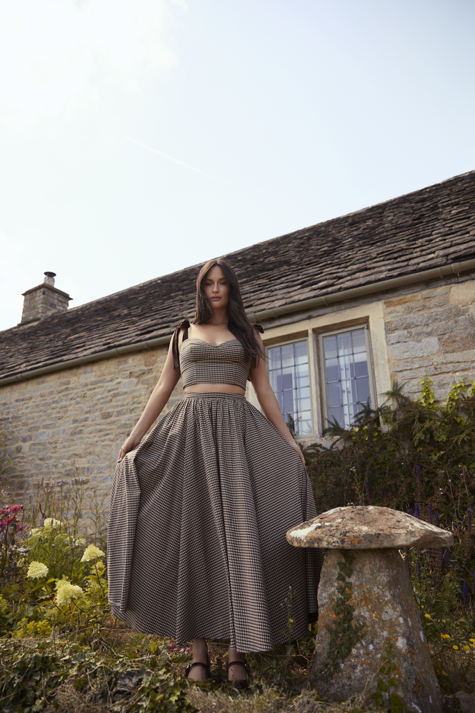 The singer gave a sneak peek of the collection recently, wearing the plaid milkmaid-esque mini dress for a Late Night With Seth Meyers appearance. There, she credited the collection as being the “perfect line for you to frolic around in.”
