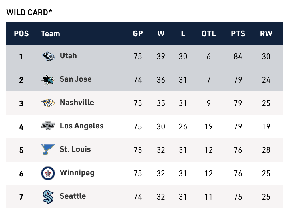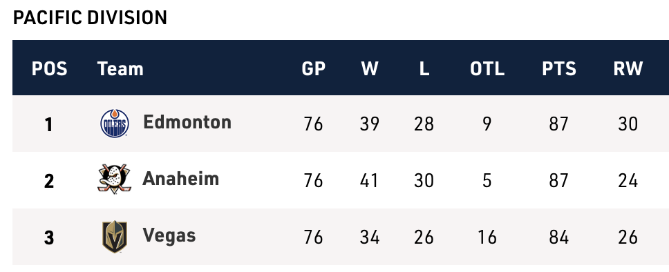 The Ducks had a game in hand on the Oilers but they squandered that in a blowout loss to the Blues on Friday, their fourth loss in a row. The Ducks and Oilers are now tied at 87 points, but since they are also tied in games played, the Oilers jump ahead by the regulation-wins tiebreaker. The Blues, meanwhile, remain on the fringe of the race with the win but have back-to-back games against the Avalanche next, which could seal their fate if they drop both.