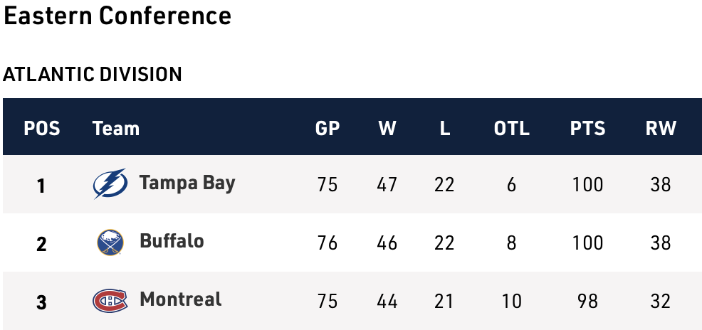 A solid run of play, with six wins in its past eight games, has Boston solidly in a playoff spot, still with a chance to push for the No. 3 or possibly even No. 2 seed in the Atlantic. One of the teams the Bruins are still chasing is the Lightning, whom Boston plays both this weekend and next. Tampa, meantime, is neck and neck with Buffalo and Carolina for first place in the Eastern Conference, which would bring a Round 1 playoff matchup against a wild-card team. The Lightning will have immense influence on how the Eastern playoff race plays out for their divisional foes, as six of their last seven games come against Atlantic teams all with something still to play for.