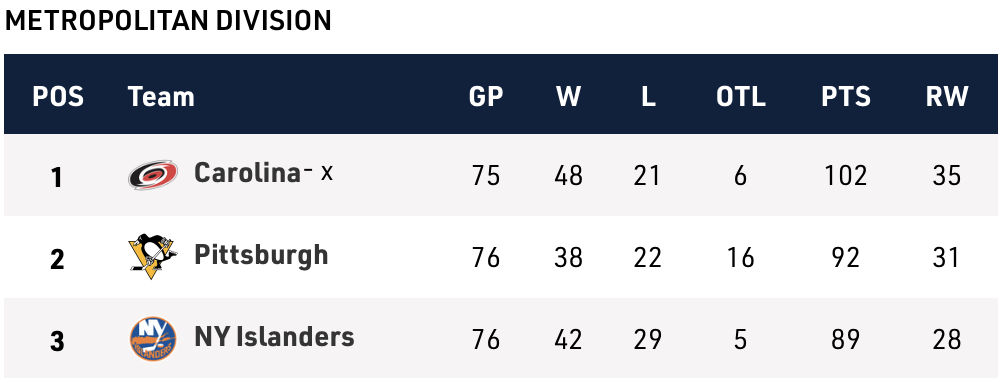 The Panthers and Penguins play two games against each other, both in Pittsburgh, this weekend. It’s interesting for a couple reasons. No. 1 is that the Penguins have an opportunity to open up even more space between them and the Metro’s third spot before they finish their season with three of their last four games on the road.