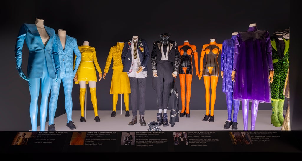 When working on John Cameron Mitchell’s How to Talk to Girls at Parties, which stars Elle Fanning as an alien visiting London in the ‘70s, Powell got to envision the future while simultaneously looking to the past. “It was a fun one to do… I found the concept of aliens in the 1970s interesting,” she says. “It’s set a little bit later than Velvet Goldmine but is a whole different aesthetic. It’s a punk aesthetic, as opposed to the glam rock aesthetic.” That is made visually obvious for visitors, with vignettes from the two films sharing the same wall in the exhibit.