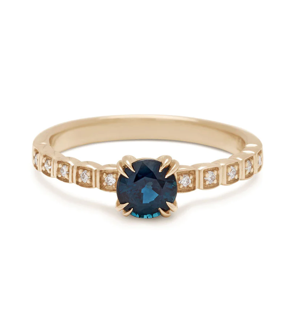 Elaborate settings are a go-to way to channel a vintage look, but, if you’re worried about the piece looking dated, reach for a blue gemstone, like sapphire.