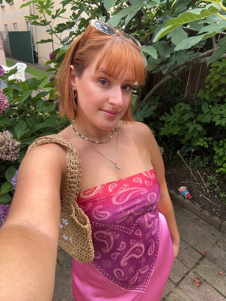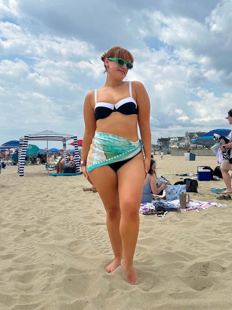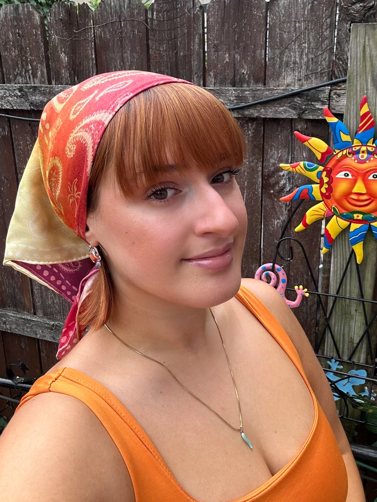 For another look, I watched this TikTok tutorial one too many times to try wearing my scarf like an elegant head wrap, and after several attempts, I figured it out. I really like how the scarf was securely wrapped under my chin, and how there wasn’t too much excess fabric swaying behind me. When paired with statement sunnies, I think it created the ultimate “European summer” look. So whether you wear your scarf like a bandana, paired with a milkmaid dress or coquette swimsuit, or tie it like a babushka, styled with a retro outfit and trendy sunglasses, you’ll have heads turning.