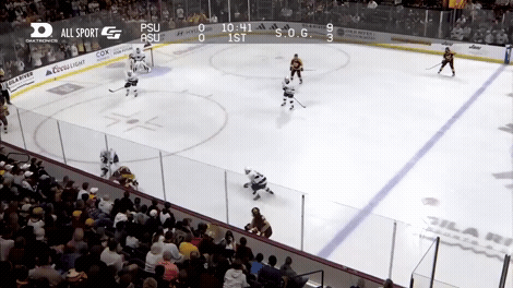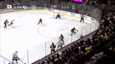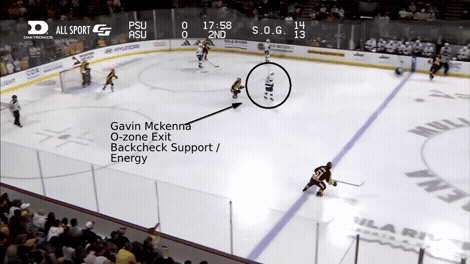 In the first clip McKenna looks to be contained along the half wall in Arizona State’s zone, but his small area agility and puck management leads to a net front opportunity for his group: