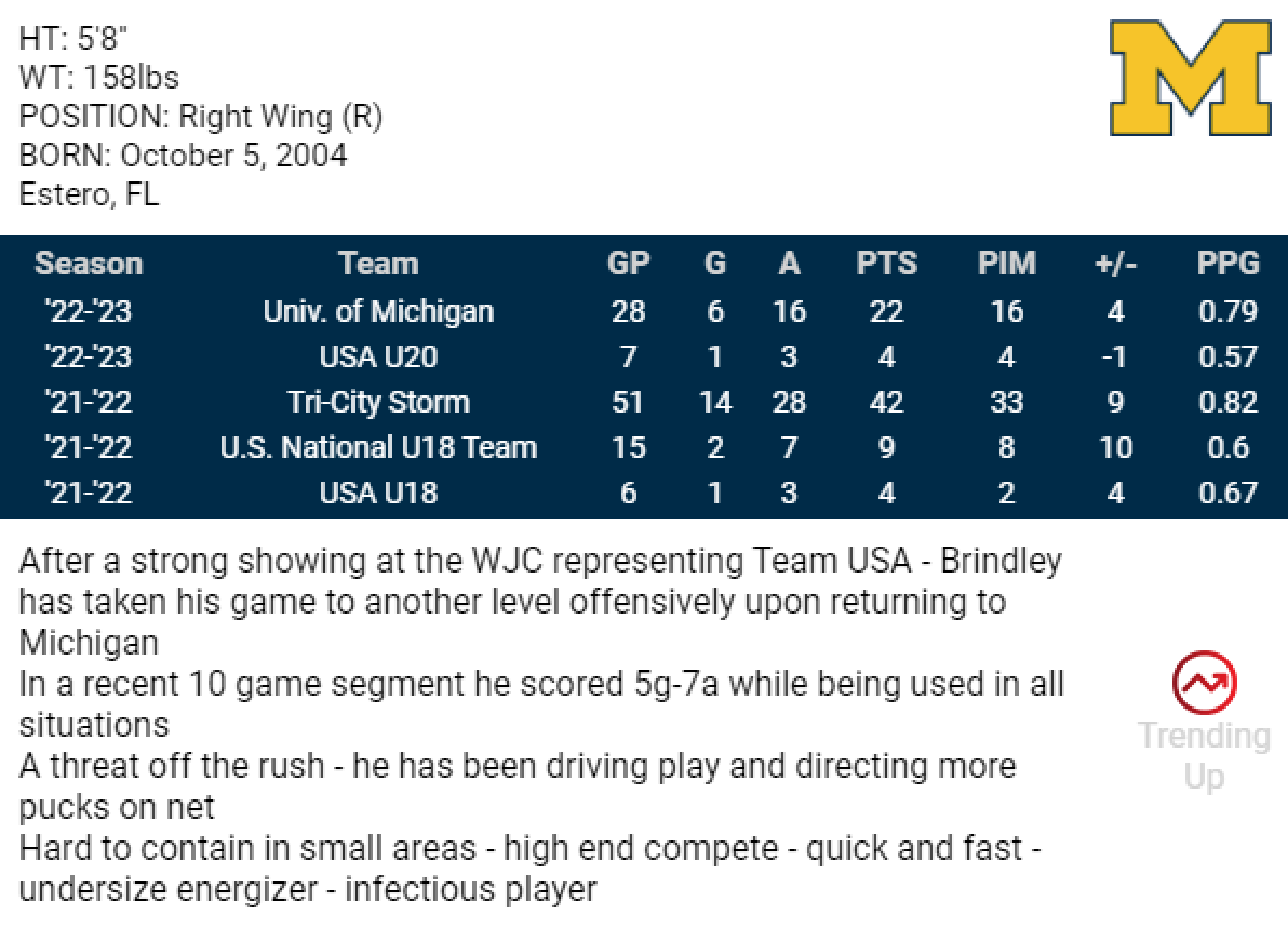 Brindley has recently been trending up offensively after a strong showing at the WJC representing Team USA. He competes extremely hard, plays a quick/darting game, and battles in the trenches. Opponents need to be aware of his battle game despite his stature. Brindley is used in all situations at the college level and projects to be a player who can slide into a variety of roles up and down the lineup.