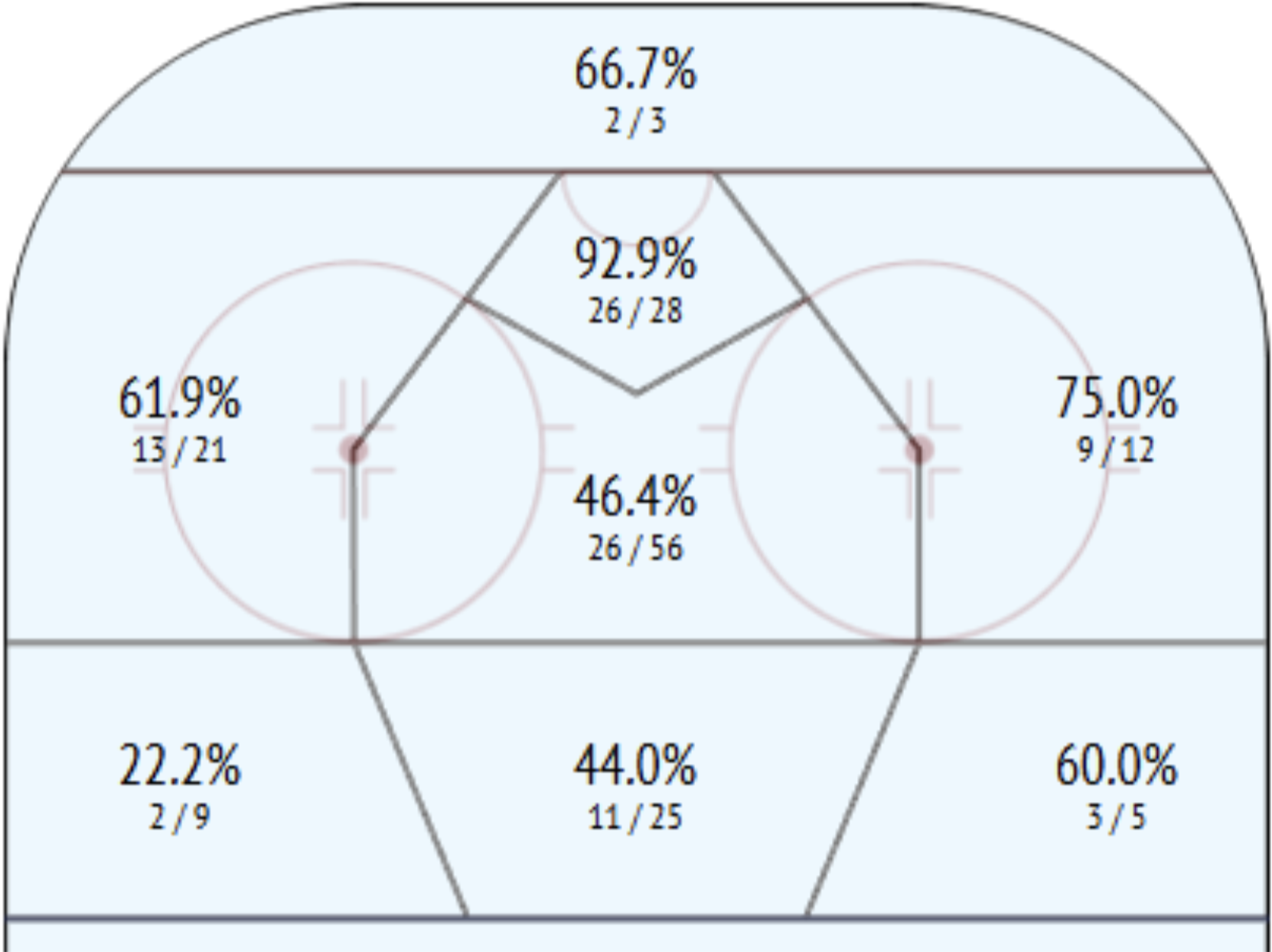 Further evidence of Stenberg’s willingness to seek out high danger scoring areas in the offensive zone comes from analyzing where on the ice he directs pucks on net. The large majority of his shots on goal come from between the face-off dots in the opponent’s zone.