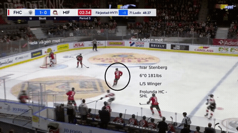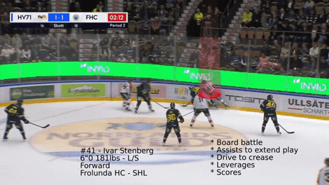 Here’s an example of Stenberg attacking off the rush with Frolunda. He gains momentum with the puck on his stick and takes a hit to make the play: