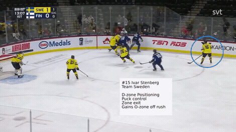 Stenberg doesn’t take any shifts off. He competes in all three zones on and off the puck. His most dynamic element is his offensive upside, but his coaches at the pro level and the most recently completed World Junior Hockey Championship, never shy away from having Stenberg on the ice in close games and taking face-offs in the defensive zone. He leverages along the boards and doesn’t shy away from contact.