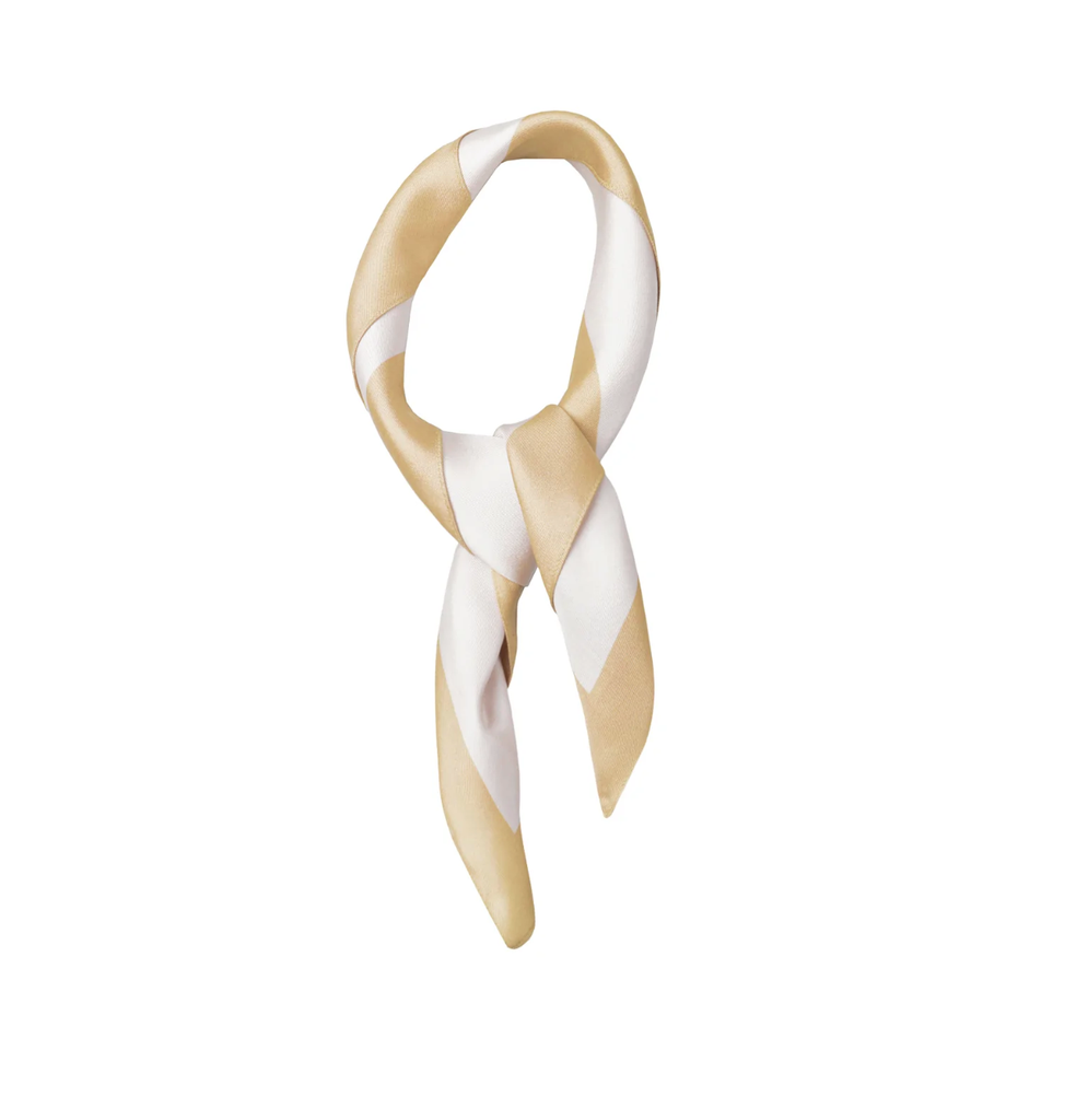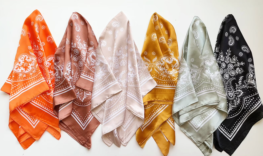 Neutral capsule wardrobes call for a bright silk bandana, whether as a hair accessory or a handbag detail.