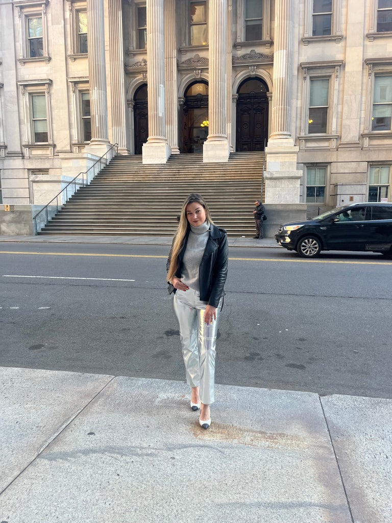 Make a case for silver as a neutral by pairing the pants with a soft gray sweater and matching heels (mine are in a subtle shade of silver). For a full monochromatic moment that never fails to look elegant, switch out the black leather jacket for a gray coat or a Coastal Grandma-inspired duster.