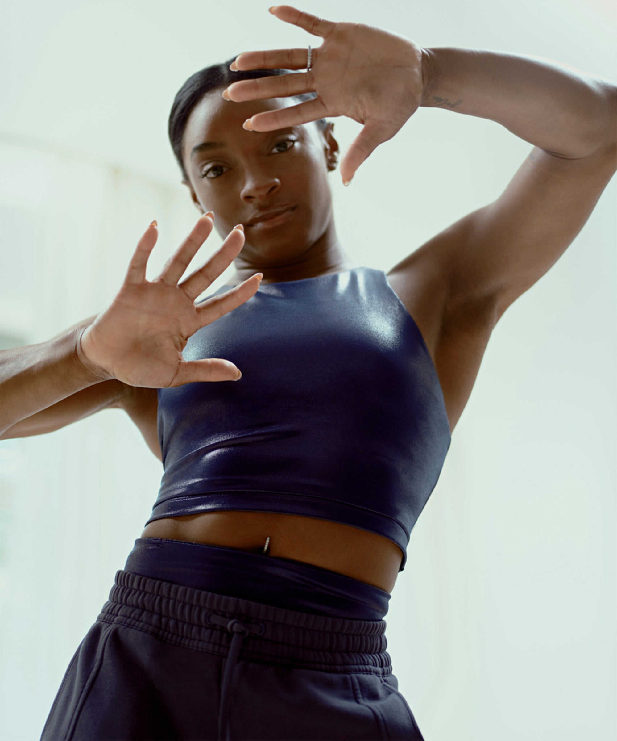 The gymnast revealed she was super hands-on throughout the creative process, starting with the material. “The fabric was the first piece of the puzzle. I loved Athleta’s holiday collection last year; specifically their Shine fabric. I knew I wanted to leverage a version of that. When the team shared the rich navy color, I knew that was it,” Biles said. “From there, it was finding the right balance of performance wear and just everyday pieces and ensuring they fit together as a capsule. I think we nailed it.”