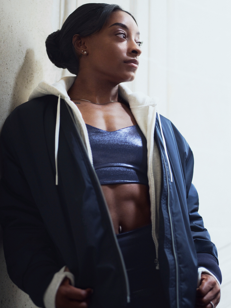 Biles is especially excited to wear her collection on the road this fall. “I’ll be traveling across the country on the Gold Over America Tour, so this collection is perfect for transitioning from show mode to chill mode. And the navy color is so easy to blend with other pieces in my wardrobe,” Biles told Refinery29.