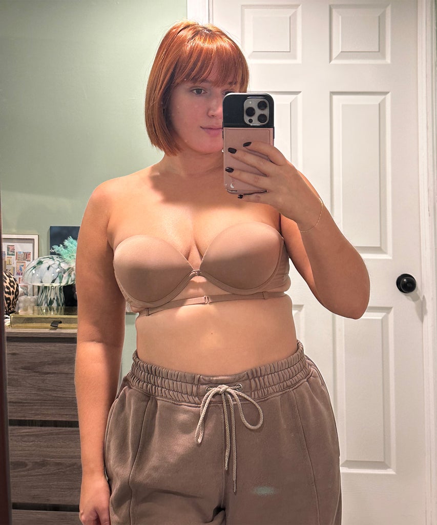 While this “worked,” I found that the straps across my stomach dug into my skin, creating a not-so-seamless look under a fitted, off-the-shoulder bodysuit. I couldn’t loosen them too much, though, because then it created gapping at the sides of the cups. Ultimately, after de-strapping my contraption, I came to the conclusion that the traditional design, with just one short strap connecting the wings in the back, was the most comfortable strapless option. While I was worried it wasn’t supportive enough, the dotted silicone on the interior cups kept the bra in place, without any discomfort or any drooping. This may become the strapless bra I reach for when needed, and I’m eager (and way less daunted) to try different strap styles now, too.” — Victoria Montalti, Associate Fashion Writer