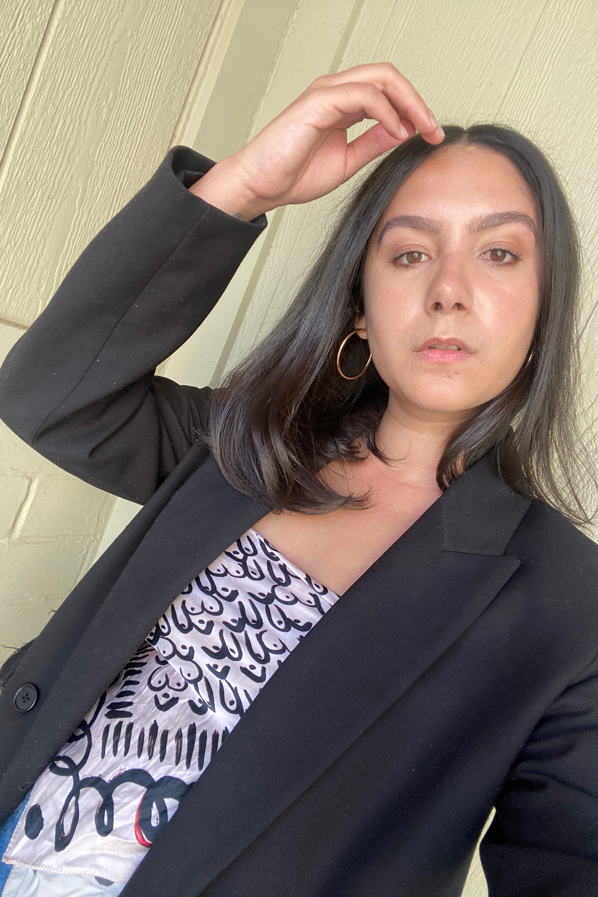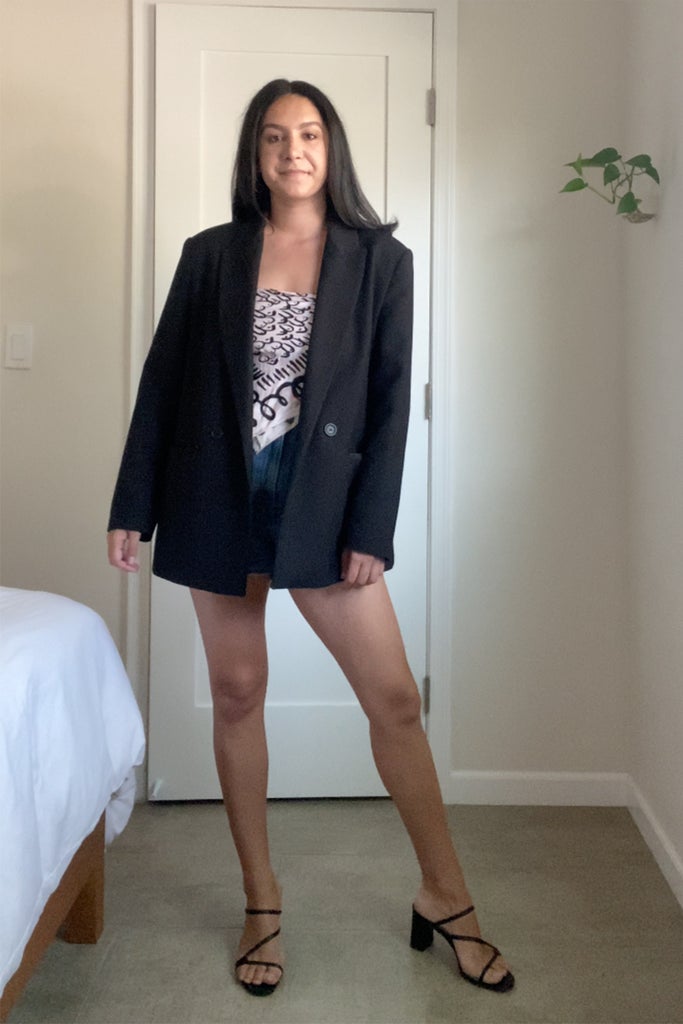 I had a few big-enough scarves at my disposal to test the trend without having to actually invest in it. For the first look, I went for a scarf featuring a boob print from one of my favorite Puerto Rican designers Amanda Forastieri. I paired it with a classic black blazer, denim shorts, and low-heeled sandals for a work day (my current office is a coworking space, so dress codes are not an issue). While the outfit was comfortable at first, I quickly found myself pulling up the top throughout the day to avoid a mishap in public, and wondered many times why I hadn’t thought about using some body tape to make up for the slippery nature of the silky scarf. This made me realize that this trend has no place in my office-ready closet.