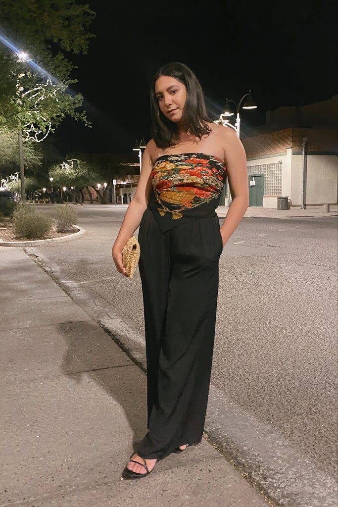 For my final look, I channeled Versace’s baroque-style prints, which have been highly popular over the past few years as the brand has tapped into its signature house code. I chose a black chiffon scarf with a floral print that I was gifted years ago, and paired it with wide-leg trousers and black sandals for a night out at a bar. To make the all-black outfit more summer-appropriate, I added a straw clutch. This one made me second guess my initial reservations about the scarf top. Not only did it feel like a grown-up version of the ’00s look, but the chiffon fabric stayed on much better, making it a lot more comfortable to wear.