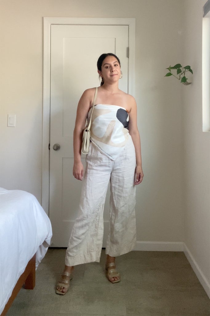 The next look involved a Marimekko silk scarf in earth tones for a casual dinner. I went for a coastal grandmother vibe by pairing it with white linen pants from Onia, a straw handbag, and gold hoop earrings. While I may have worn this one only for a few hours, I once again kicked myself for not investing in body tape as I continued to tug and pull on the top, this time in fear of a slip in the restaurant.
