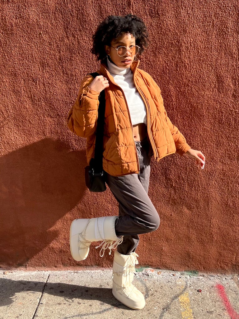 Which brings us to my first look that I like to call astronaut off-duty. I’ll be honest, after wearing my boots exclusively around my apartment in pajamas, when it was time to style them for the concrete jungle, I panicked. It was a sunny but 45 degree Saturday in NYC — meaning shivering in the shadows but perspiring in a jacket under the sun — and my friend and I had shopping in SoHo confirmed on the docket. So, I emulated celebrities’ denim-free looks and opted for a pair of discontinued American Apparel joggers, a cream Zara turtleneck sweater, the Shopping team’s favorite Free People puffer jacket, and a simple black & Other Stories shoulder bag.
