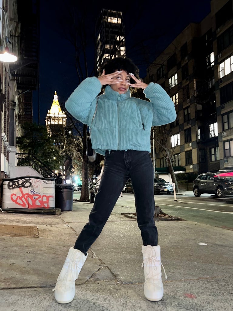 This funky light-turquoise Urban Outfitters corduroy puffer jacket might be the top-complimented garment in my closet — and, in my opinion, it creates sweet, sweet harmonies with my cream Icons. Perhaps it’s because both pieces echo snowy, oversized ski slope fashion or both have equally icy undertones, but I loved the way they complemented one another. To not distract from their love affair, I plopped on a pair of plain straight leg black denim jeans (thrifted), a simple black Zara turtleneck, and my prized Gucci bag. I was nervous that my attire would not be well received at the traditional Italian restaurant my friend and I reserved a table at, but upon entering, a waitress chimed, “I love those boots!” and quelled any lingering self-conscious thoughts.