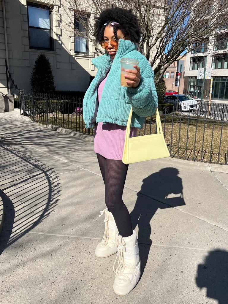For the last look, I wanted to carry-out my pastel, extra-femme fantasy and go loud. Also, by this point, I’d worn my Moon Boots to the grocery store, the cafe, etc., so, I no longer felt odd sporting them like this on a casual Thursday afternoon. I wore my lavender Aritzia knit sweater dress, tried & true UO corduroy puffer jacket, black ribbed tights from who knows where, wrapped it all together with a Behno pastel yellow shoulder bag and of course, an iced oat milk latte.