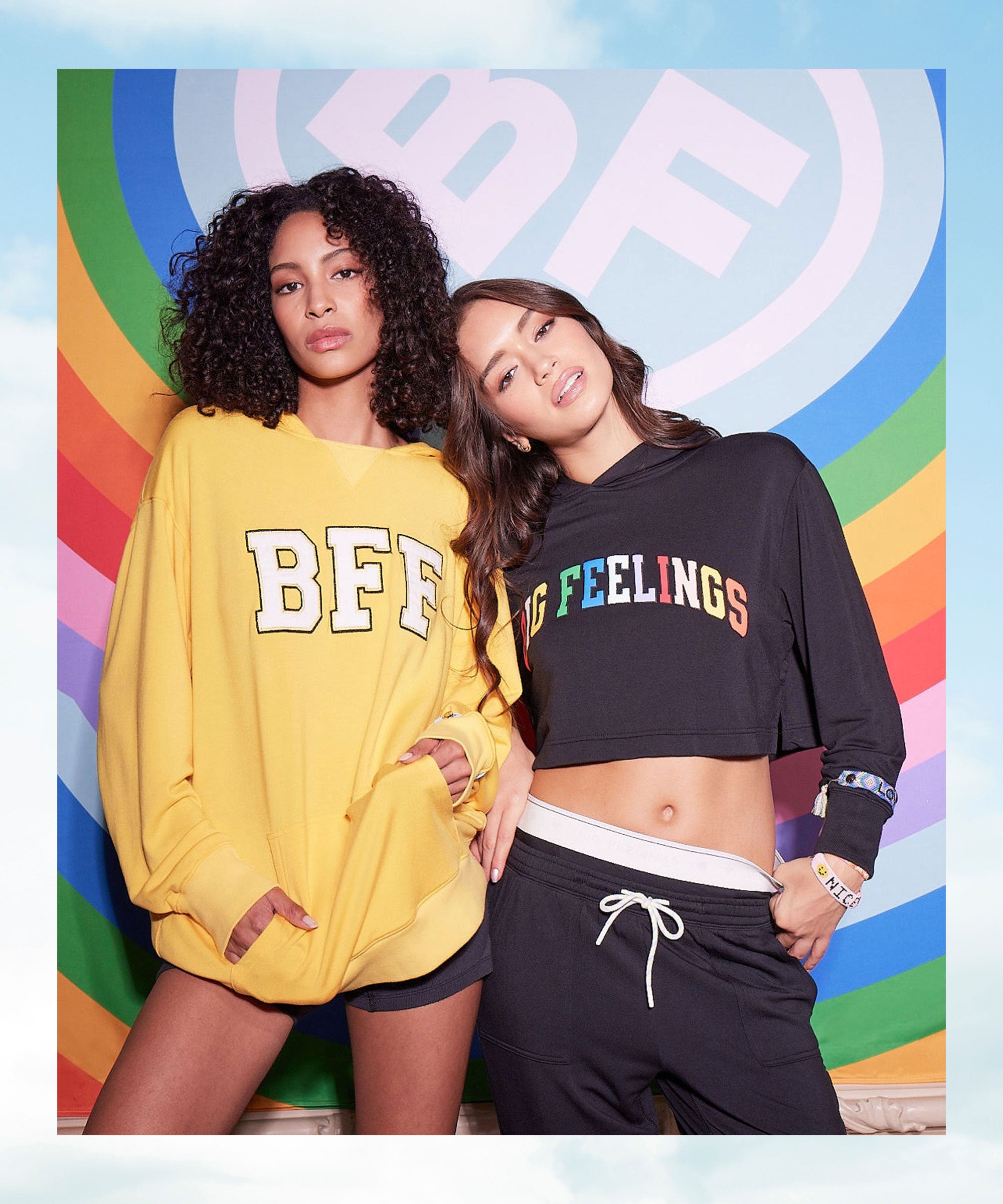 “In the first drop, the idea was to bring the brand to life. What was most important to us were the fabrics; everything from Big Feelings is meant to feel like a hug. All the fabrics have cute names that are representative of how you want to feel: Cozy Feels, Dreamy Feels, Cool Feels, Peace Feels, and Calm Feels. The fabrics are so soft and yummy, and the whimsy and quirkiness are there too. All the sweatshirts have little messages embroidered into the hood, and friendship bracelets attached to the sleeve of the sweatshirt so you can trade them. And the colors range from a soft palette with our Love set that’s more soothing to a bright palette that feels more playful and energetic, like our BF red sweatshirt.”