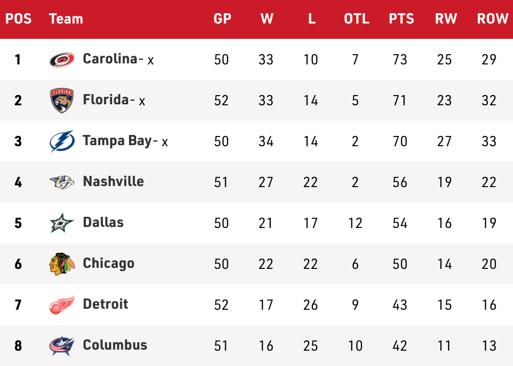• Tampa has the best shot to catch the Canes, but there’s not much room for error so the back-to-back games they have against Detroit this weekend will set the tone for the coming week. The Lightning will then have two games against Dallas this week, which will be hugely important in deciding that last playoff spot in the division, and could also influence the top of the table.