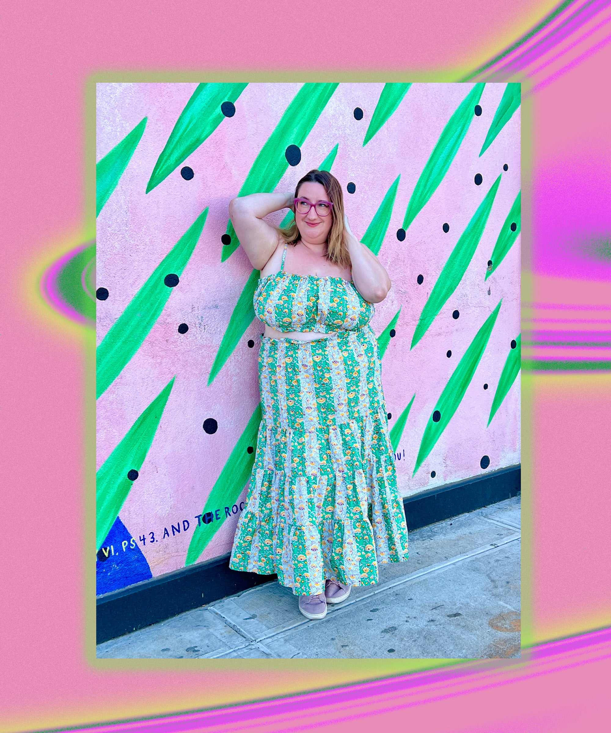 Designers Purna Khatau and Phoebe Vickers are known for great matching sets, so this striped floral co-ord was at the top of my try-on list. As soon as I put it on, I knew it was a winner. It is somehow absolutely precious without being saccharine. The crop topmaxi skirt combo feels very of the moment, and the lightweight cotton makes it breezy enough for the hottest of summer days. It layers well with the scallop bikini for a beachwear ensemble, but also would look right at home at a downtown brunch or on a picnic in the park. Unless you are blessed with extra curvy hips, I’d say size down if you are between sizes. I typically size up with non-stretch cotton, but, after experiencing how roomy this style runs, I’d get a 1x if ordering again.