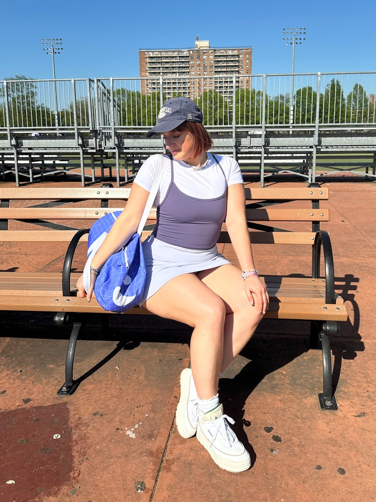 When it came to styling my Vuori tennis-inspired outfit, I kept the accessories casual and colorful. I put on every friendship bracelet and charm bracelet I could find in my jewelry box, as well as a complementary beaded necklace. I also threw on my go-to (i.e. super faded) baseball cap and a fun purple gym bag. Then I slipped into three-quarter ruffle socks and platform sneakers for my trip to the park.