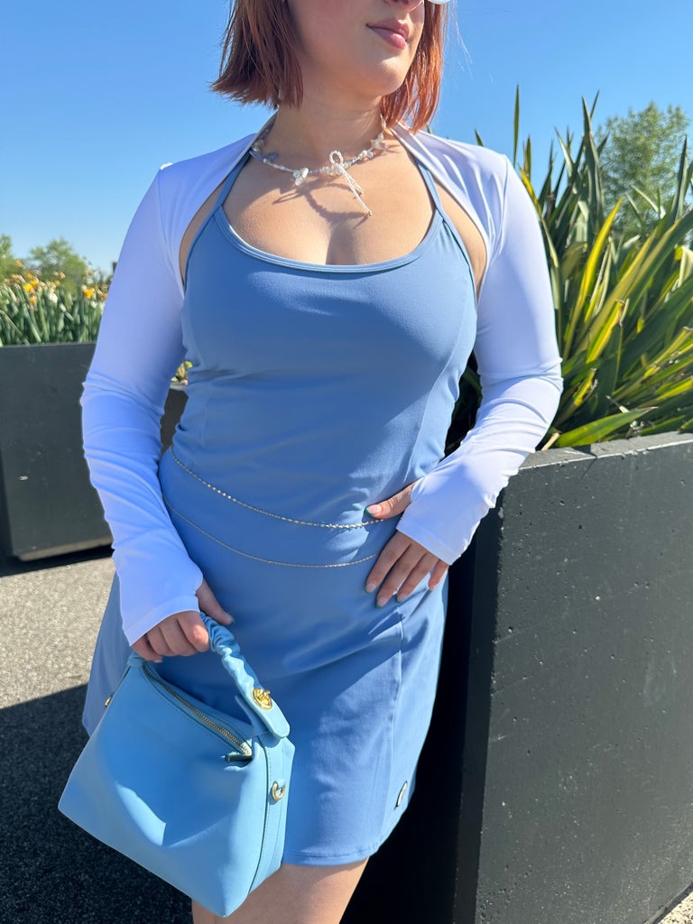 I decided to dress up my Vuori tennis dress for a trendy “elevated athleisure” look. I paired it with bright-white sports sleeves because, hey, a shrug can elevate anything. I also opted for my on-trend gingham Nike Cortez sneakers rather than basic white tennis shoes, but I could’ve easily worn strappy sandals with this dress too. I had the most fun with my jewelry, though, putting on pearl drop earrings, an asymmetrical beaded necklace, and a shimmery belly chain. Then I pulled the outfit all together with crystal-adorned white sunglasses and a buttery blue top-handle bag. In the end I felt chic, and certainly not cheesy.