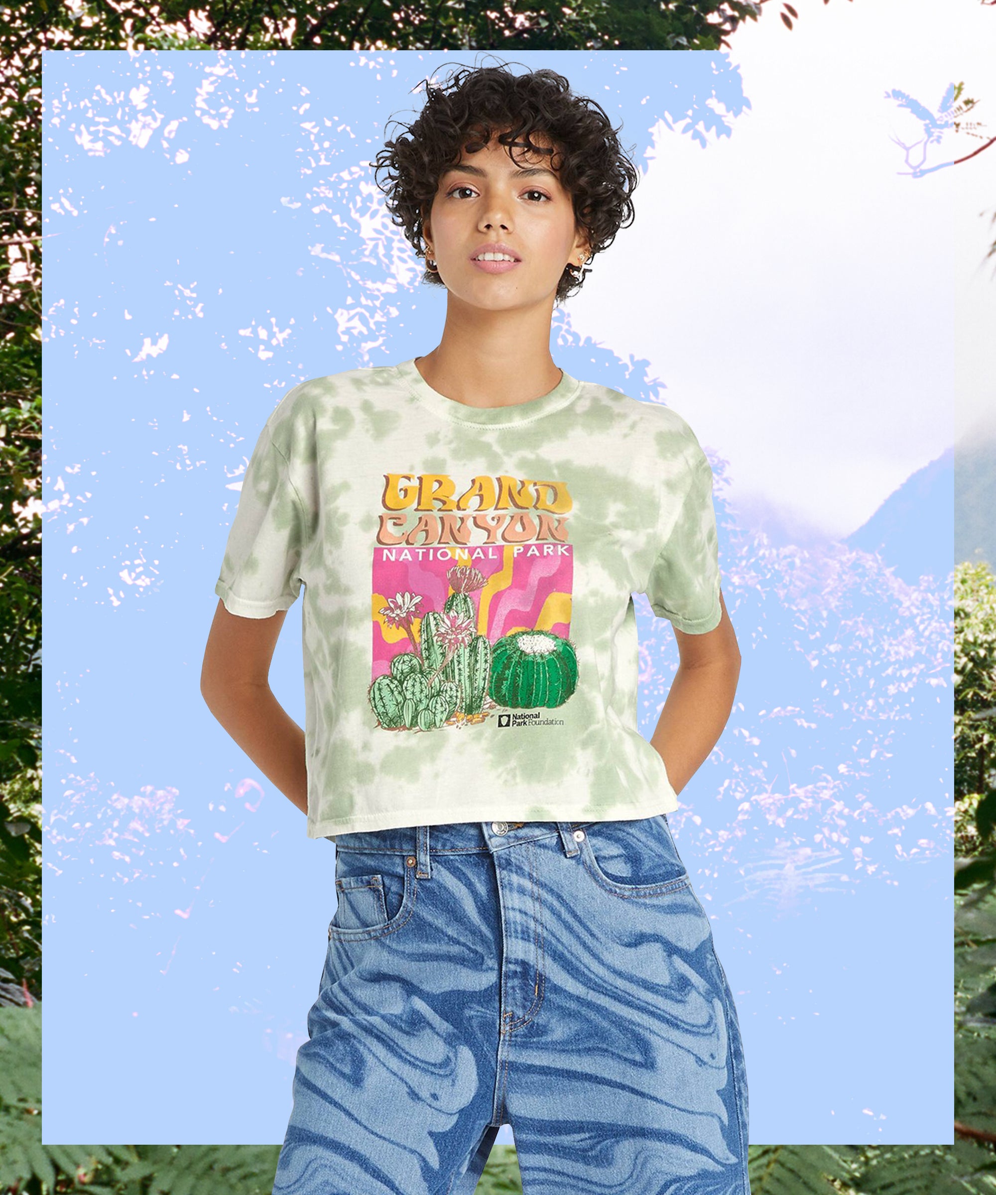 The shirt in question is by National Park Foundation, the nonprofit dedicated to protecting, well, our national parks. It features a green tie-dye base and a funky ’70s-era vibe with a design of cacti against bright pink and yellow swirls. It’s perfectly cropped for a summer look, not too short but not too long.