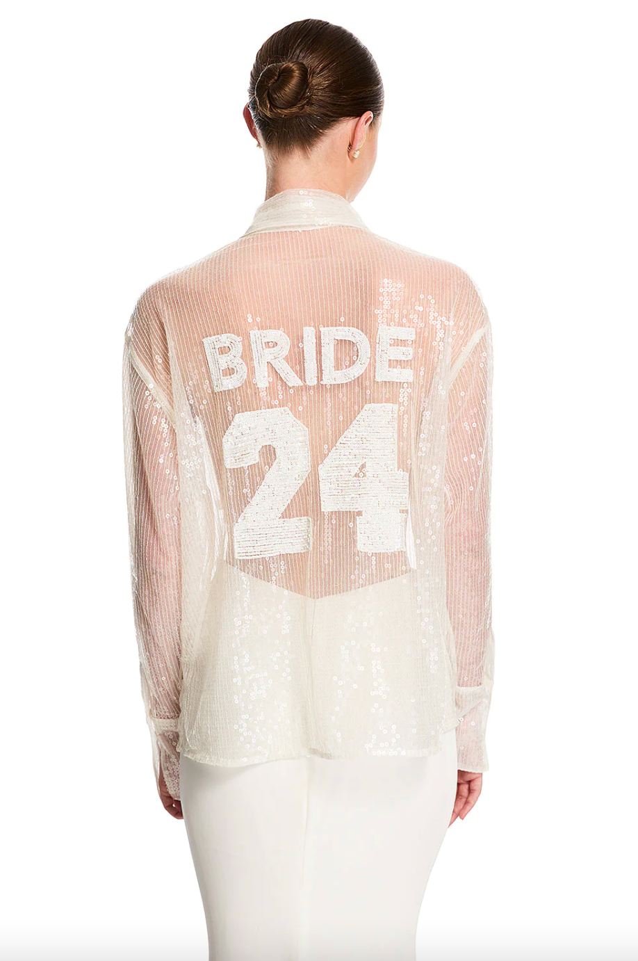 For brides-to-be who love sports, this “wedding jersey,” from Australian brand Kyha Studios, gives the sporty staple a bridal twist.