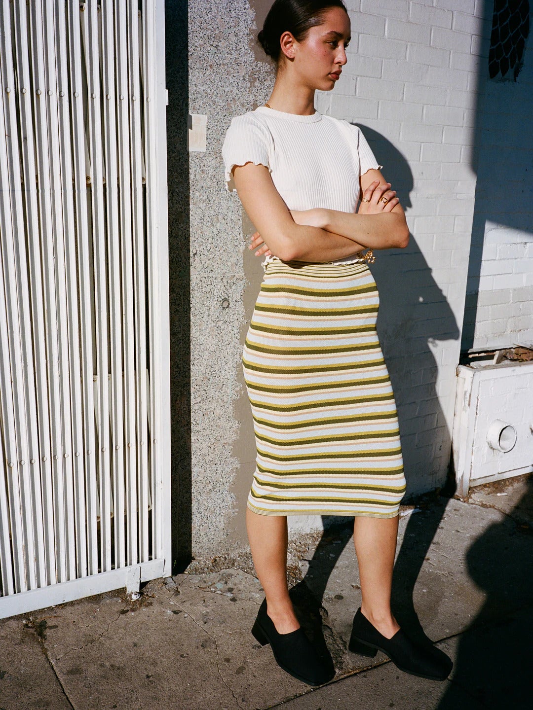 Headed to an outdoor soirée alongside your co-workers? Channel office vibes with a crisp white top that boasts an unexpected lettuce-hem detail, along with a sparkly knitted skirt that’s more crayon than pencil. Chunky black mules add a sensible vibe, but a comfortable lug sole will allow you to trod around in the mud without having to worry about sinking heels.