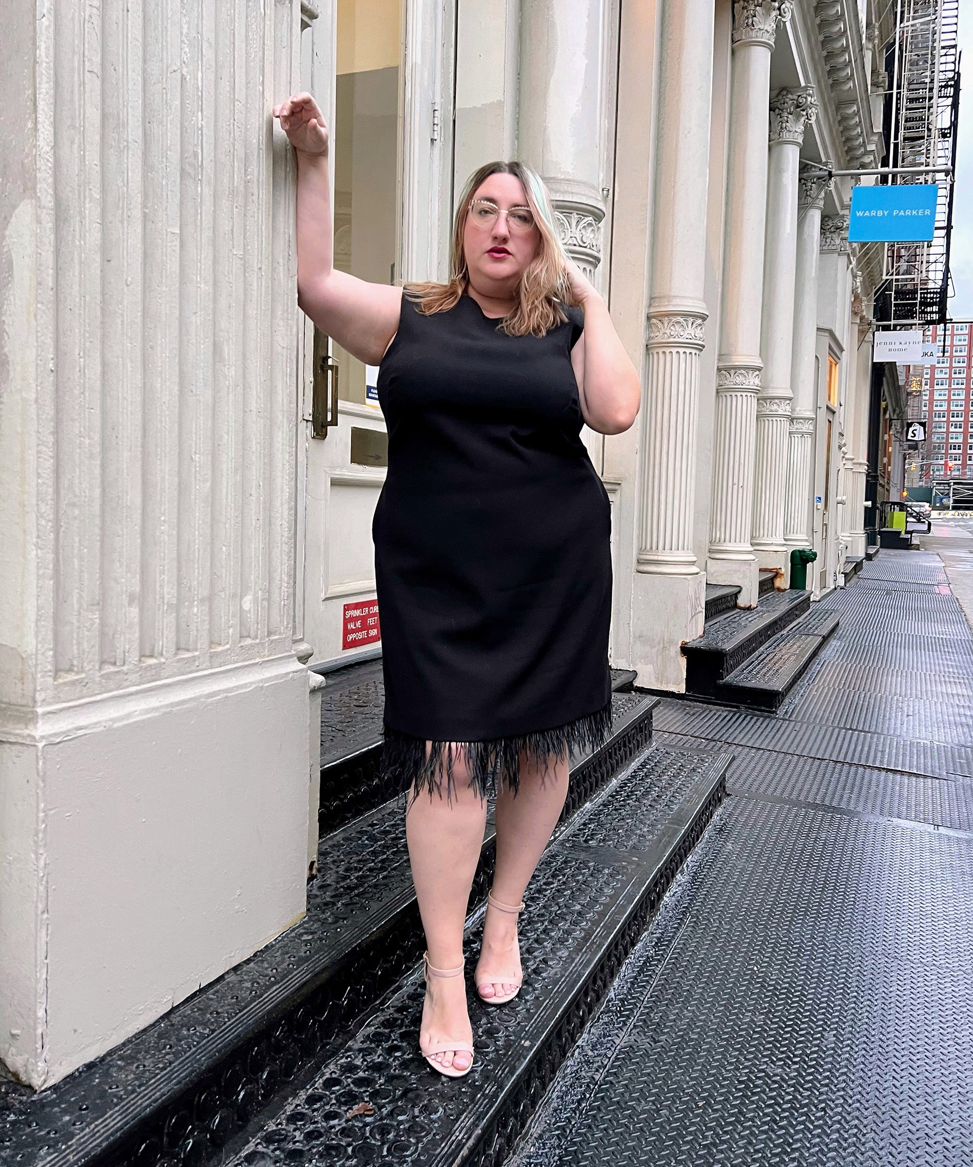 Plus-size holiday look for a work party: Laws of Motion feather-trimmed sheath