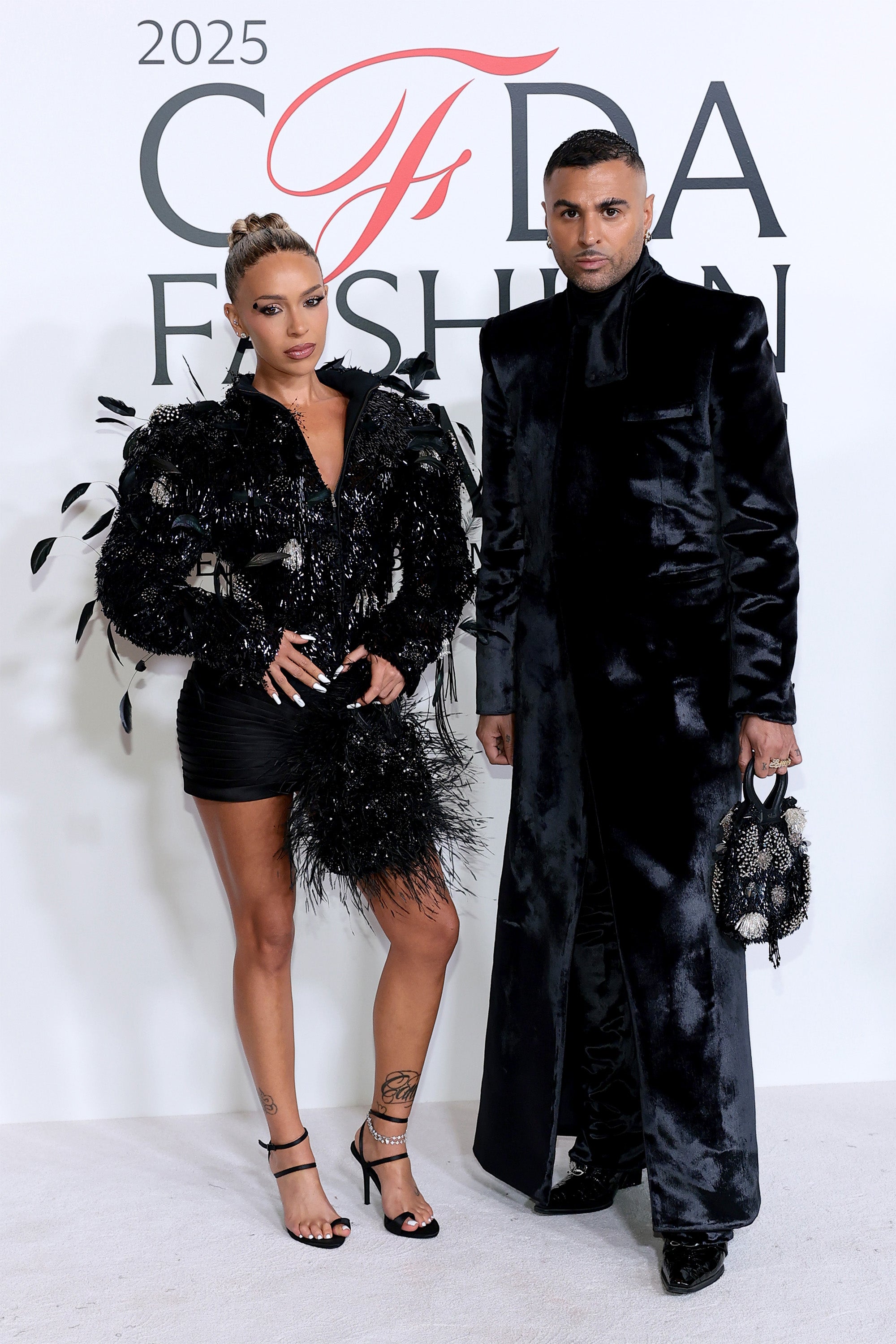 Spanish artist Bad Gyal accompanies CFDA American Accessory Designer of the Year nominee Raul Lopez, both wearing sleek black ensembles from the designer’s brand Luar.Photo by Dimitrios Kambouris/Getty Images.
