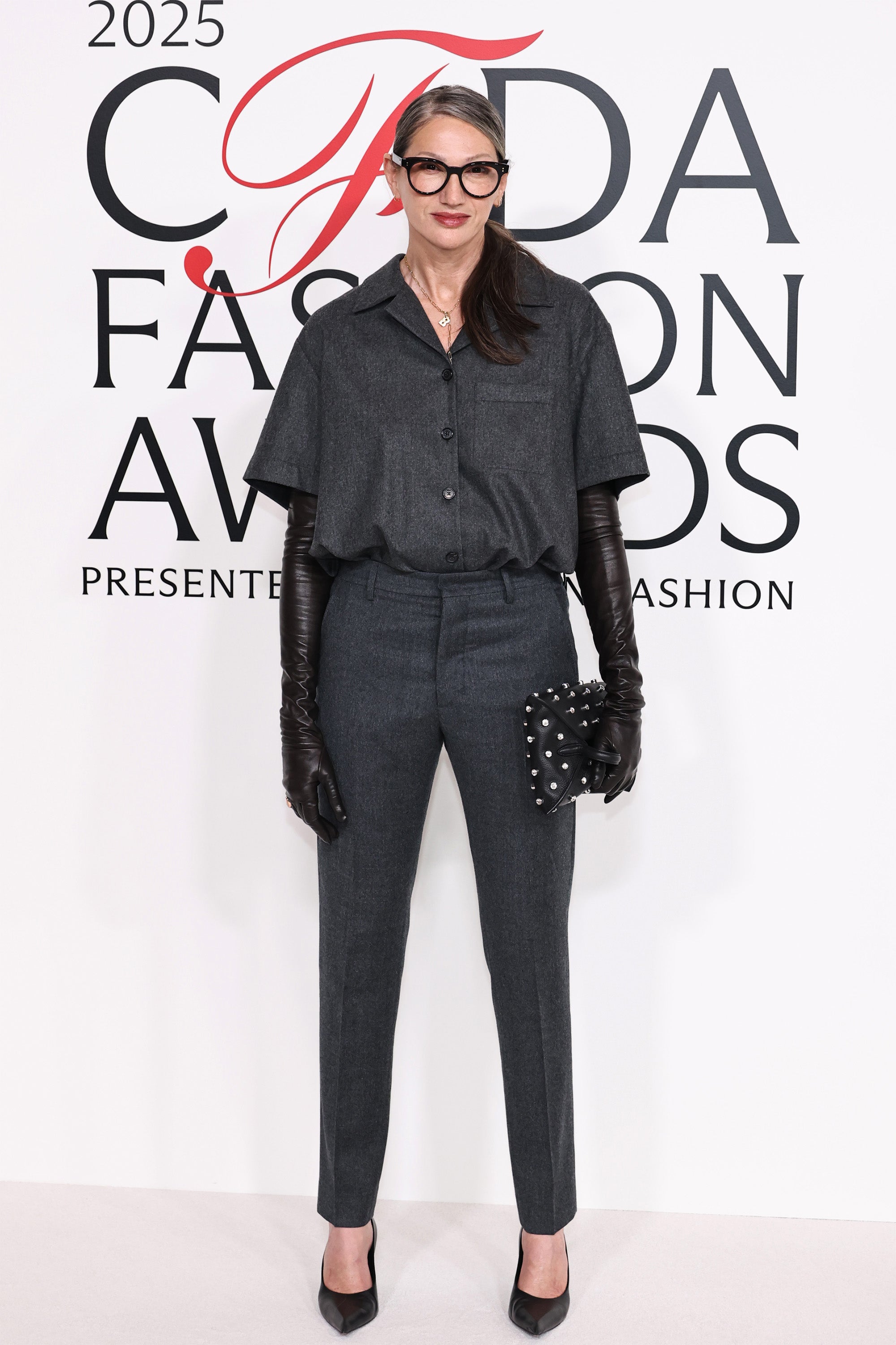 The CFDA Red Carpet Host and fashion designer Jenna Lyons arrives in a charcoal suit and elbow length leather gloves.Photo by Jamie McCarthy/WireImage.
