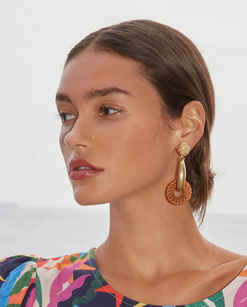 Straw always makes a comeback in the summertime, especially when it comes to donning straw bags and floppy beach hats. But really, straw (and raffia and rattan and jute) is so much more versatile than that. We’ve recently made a case for wearing raffia accessories year-round. Now, we’re making a case for all the different ways to incorporate the natural material into your wardrobe. Read on how to see how to work straw and raffia into your summer accessory arsenal — from cowboy hats and tote bags to hoop earrings and woven wedges.