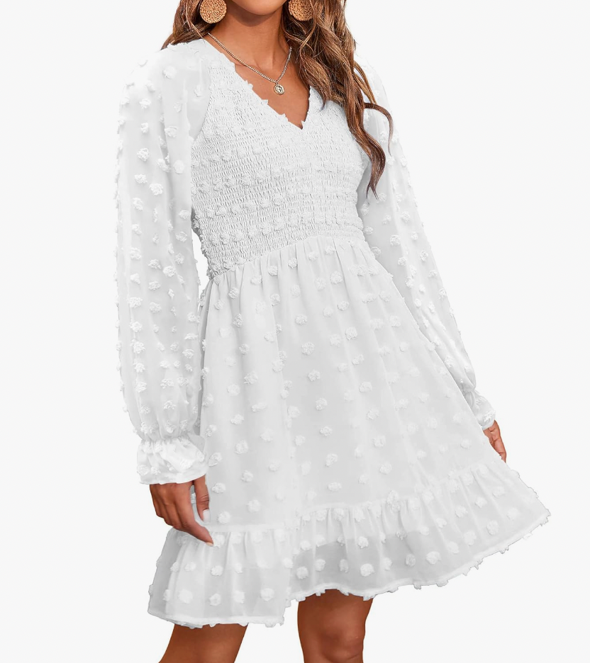 BTFBM Long Sleeve V-Neck Smocked Swiss Dot Mini Dress, $, available at Amazon