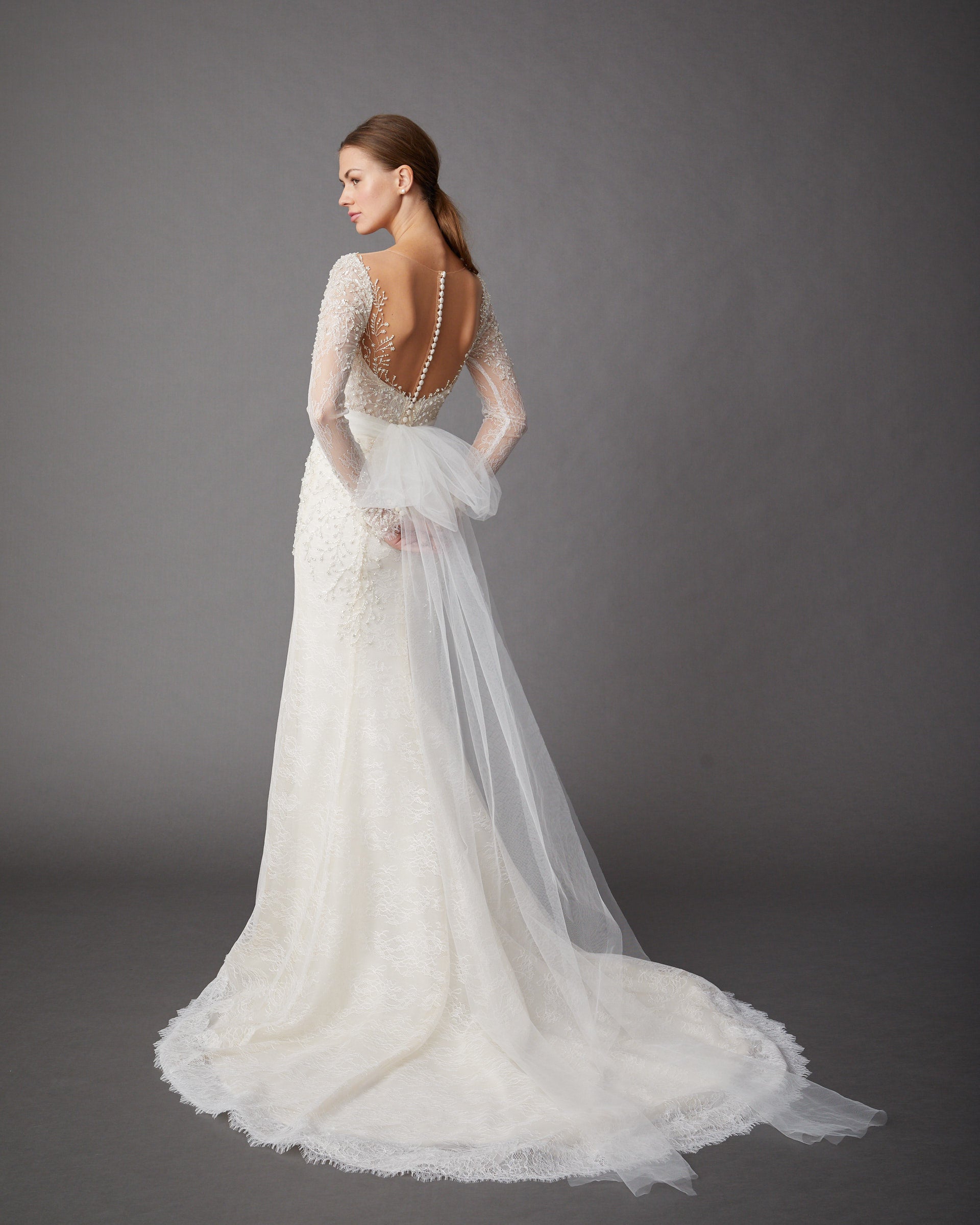 It’s a common practice for brides to trade gowns for mini dresses during the reception, to make way for partying the night away. For fall 2022, designers and brands are eliminating the need for a second dress. Instead, they are offering gowns with detachable pieces — from sleeves and overskirts to bows and trains — that can take a bride from the altar to the dance floor with a quick tug of an overskirt.Long-sleeved gown with detachable bow train from Allison Webb