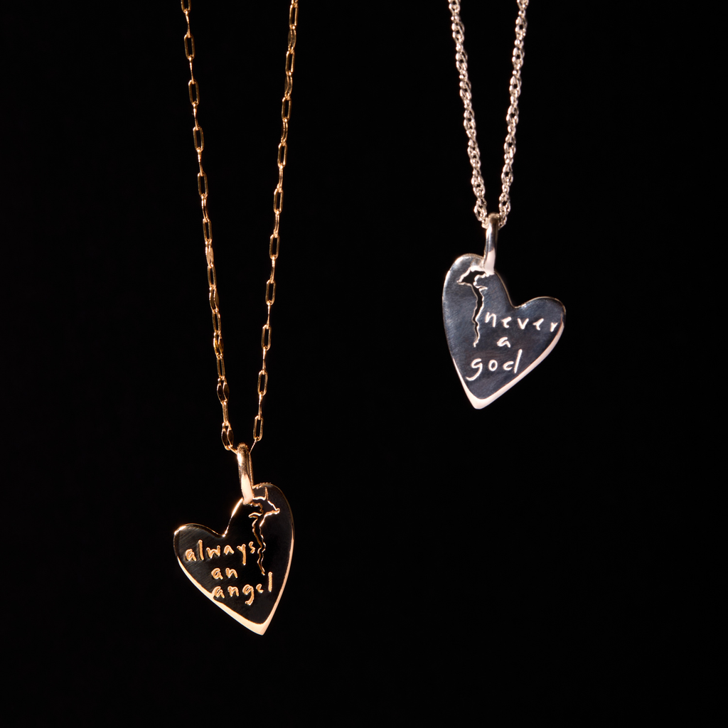 The two other newest additions to this limited-edition jewelry collection are these cracked heart charms (that would honestly make for great V-Day heart-shaped jewelry gifts). Both the gold and silver charms include lyrics from boygenius’ Grammy-winning song “Not Good Enough.” One side of the charm reads “Always an angel” while the other reads “Never a god,” all engraved in Dacus’ handwriting.