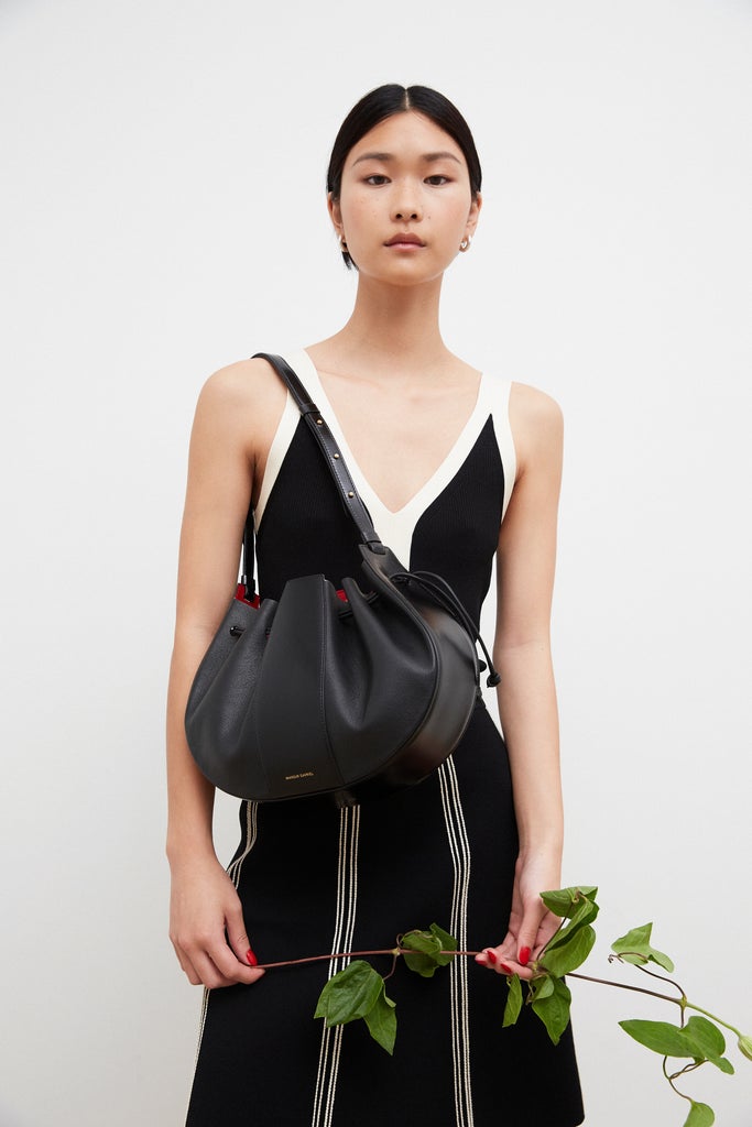 The Lilium Bag is Mansur Gavriel’s evolution of their signature bucket-style. In my opinion, if a croissant bag had a chic cousin, this baby would be it. Although Mansur wasn’t inspired by this elite crescent-shaped pastry, the shape was inspired by a lily. It features a drawstring that gathers the bag at its opening — kind of like the bud of a flower — and has a curved silhouette that is meant to rest against your body comfortably. It’s made with a combination of durable brushed and soft Italian calf leathers, comes in two sizes: standard and large, and five colors: black/flamma, caramel, mint, dahlia, and bianca.
