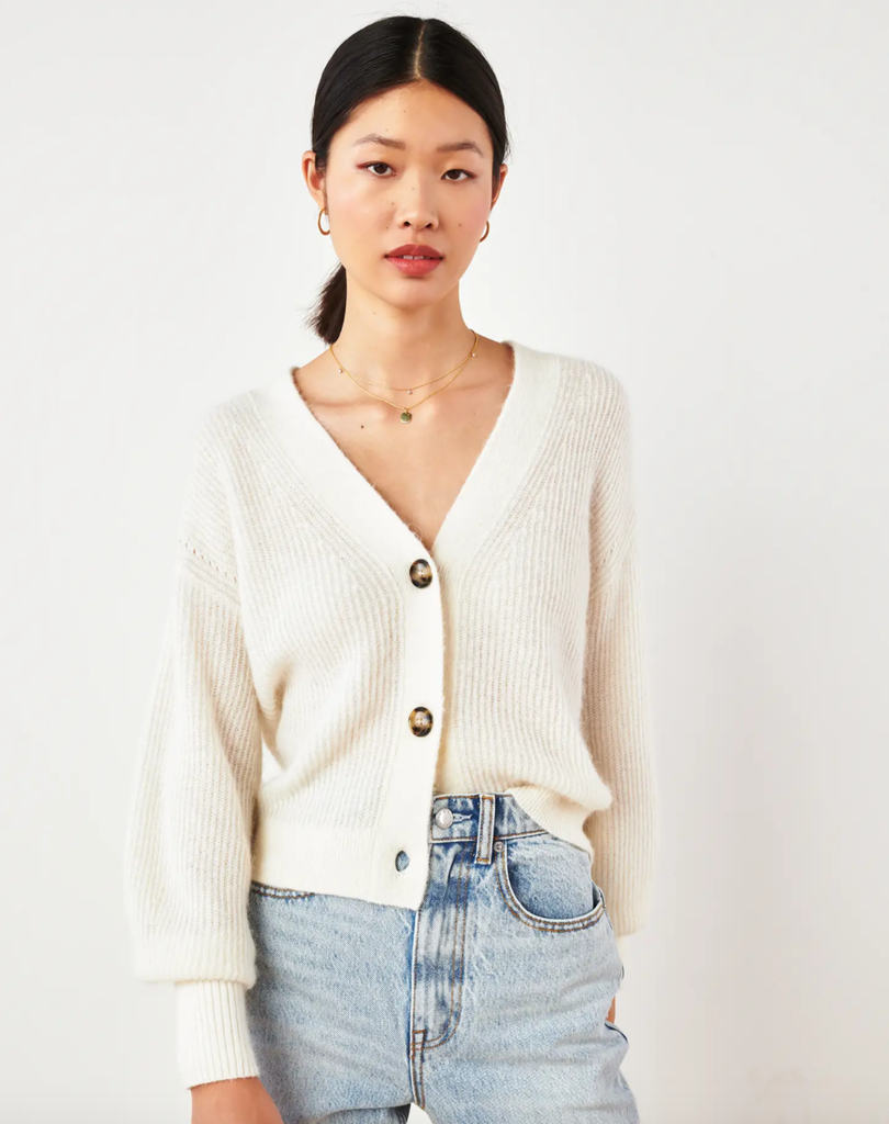 It’s all about the details when it comes to this 100% cashmere cardigan: the boxy cropped fit, the deep V neckline, the three-button front, and the ribbed cuffs and hems make this a pick that’s as soft as it is special.