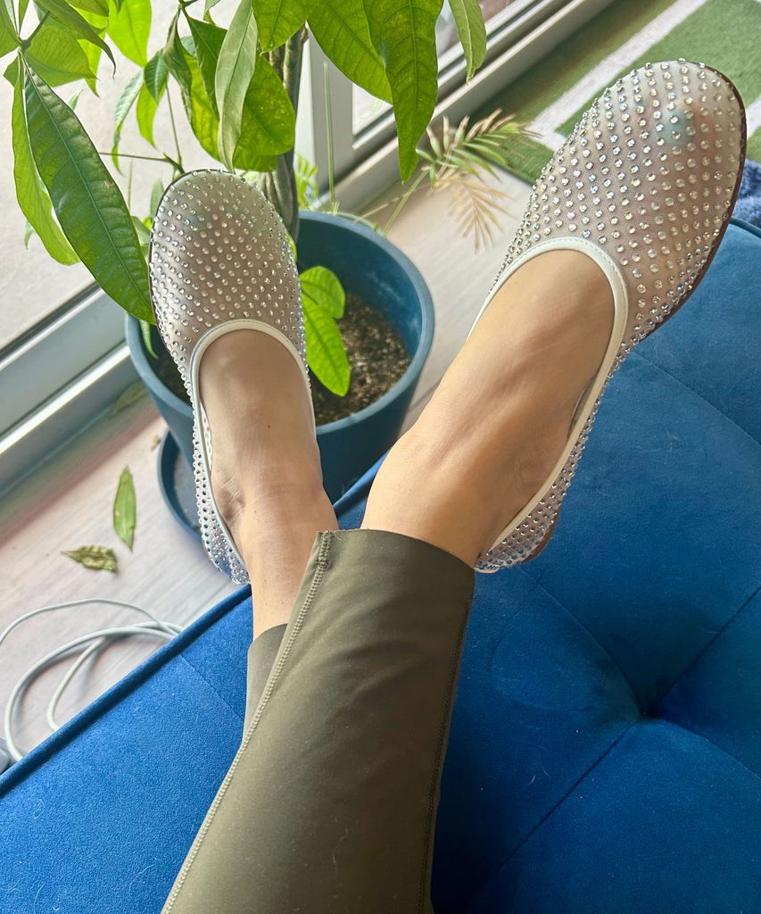 ICYMI, ballet flats are fully back. However, if you need further convincing, allow us to make a strong case for Dear Frances’ luxurious take on the classic style: The Balla style debuted last year and was immediately a hit among the fashion set, thanks to its sock-like, foot-hugging shape. Flats sometimes get a bad rep for scarifying style for comfort, but not these. The elongated profile and mesh textile make them an obvious choice for the modern minimalist, and recently, Dear Frances unveiled new crystal-studded colorways that have positively set our hearts aflutter. Ahead, read along as three Refinery29 shopping editors take the style out for a spin.