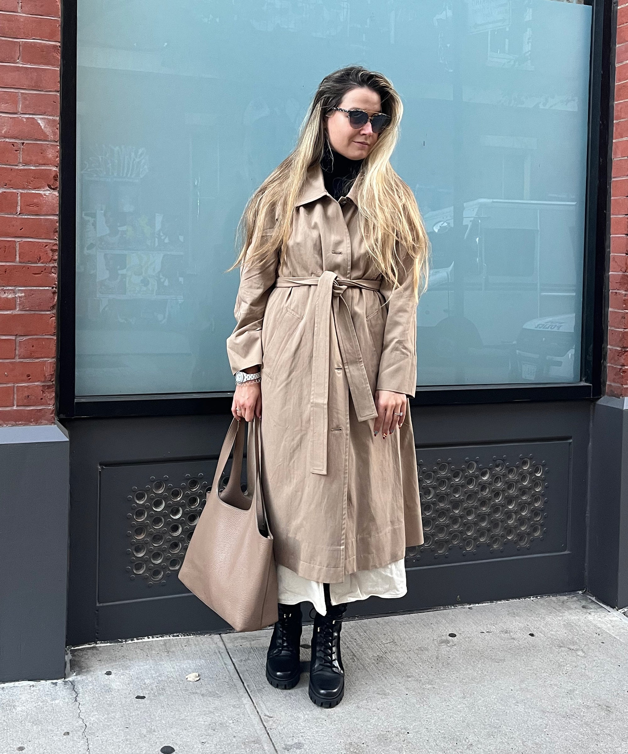 “Living in New York City, I only have a few months a year to wear my favorite trench coats; during the rare time when it’s not too hot or cold for lightweight outerwear. This is why you will find me in one for almost all of fall. I pair mine with my year-round go-to turtleneck (in particular, ones from Uniqlo’s HeatTech line when the temperatures start dropping), for the ultimate foolproof formula for getting out of the house quickly. The look goes with truly everything from midi skirts and combat boots (pictured above) to jeans and booties.” — Irina Grechko, Fashion Director