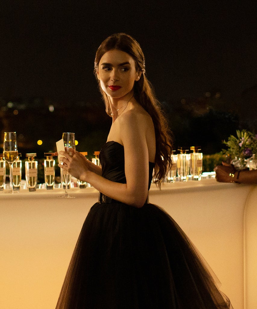 Emily in Paris follows 20-something Emily (played by the newly engaged Lily Collins), a Chicago marketing executive who gets sent to Paris for a year when her company acquires a French luxury marketing company that needs (but doesn’t want) help with their social media strategy. From the start, there is no doubt that Emily, much like Collins in real-life, watched Sex and the City as a young woman, and was inspired by Carrie Bradshaw’s unapologetically over-the-top style. In the most obvious example, in episode 2, Emily wears an Alexandre Vauthier strapless top with a black tulle skirt, an homage to Carrie’s tulle skirt in the series finale of Sex and the City, which also takes place in Paris. In another, she dons earrings that say “Emily” in cursive, a nod, of course, to Bradshaw’s famous “Carrie” necklace.
