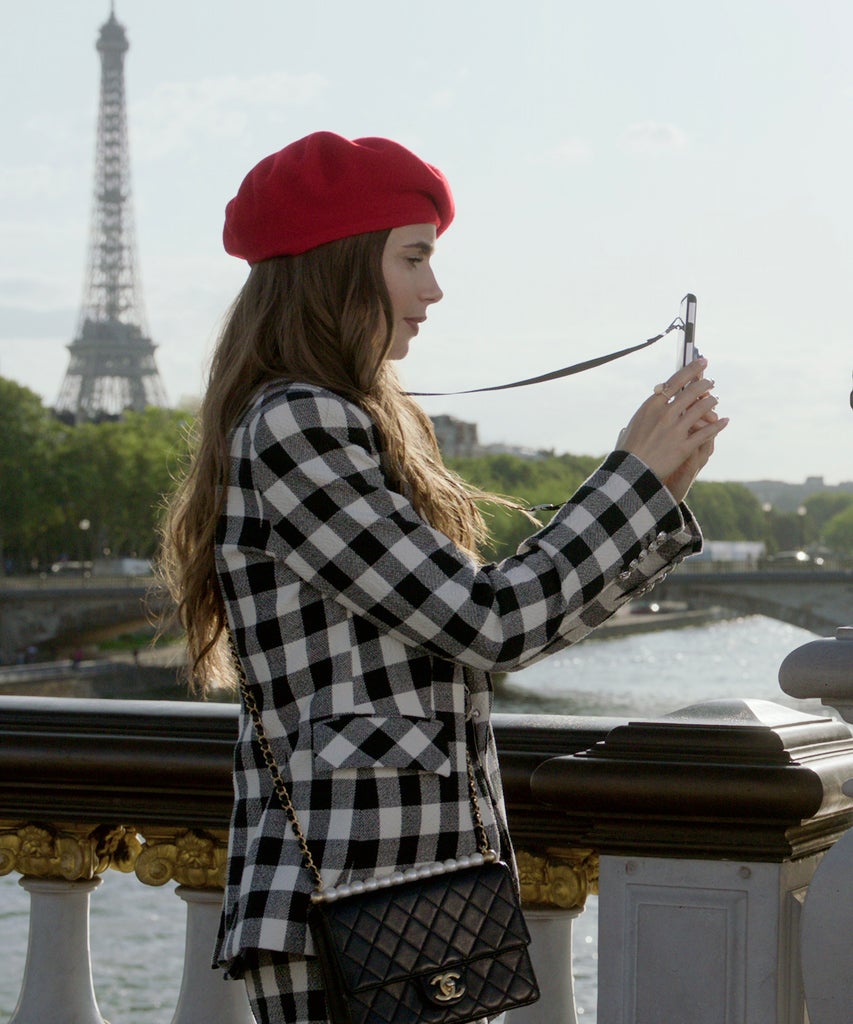 Speaking of the Gossip Girl star, there’s definitely traces of the late-‘00s show, about Upper East Side high school students, present, too. (This makes sense as Emily admits to watching it in the series.) While Emily doesn’t have Blair Waldorf’s love for all things preppy, there are traces of Queen B in the green Chanel jacket she wears to an influencer lunch, and in her plaid skirts. There is also Emily’s penchant for hats — classic French berets (I imagine Emily bought them specifically for Paris), Kangol bucket hats, and beanies all make an appearance! — and bold outerwear that includes brightly colored coats that look to be made out of cashmere, as well as statement jackets.