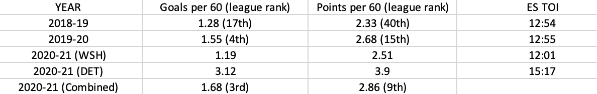 Starting with Vrana, he was always a player in Washington who had strong scoring rate per minute stats, but wasn’t given an increased role. With the Red Wings in a short window, Vrana’s even-strength time on ice shot up and his numbers did, too.