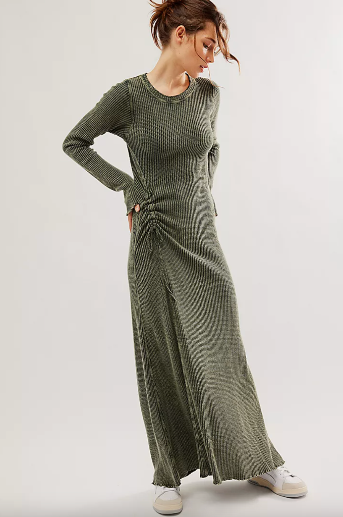 This effortless maxi dress is laidback and cozy — the perfect blend for a lazy-day winter frock. You can run outside with a puffer coat and your UGG slippers, or style it with black pointy ankle booties, a thick black belt, and a leather jacket. The side ruching and lettuce trim hem add subtle detail to the one-piece, allowing you to fashion it however you please.
