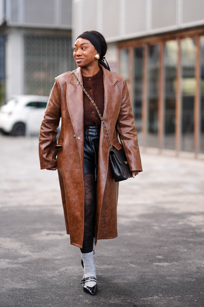 COPENHAGEN, DENMARK – FEBRUARY 01: A guest wears a headband, golden earrings, a brown leather long coat , a brown fluffy cardigan, a Chanel bag, gray socks, pointed shoes, outside TG Botanical, during the Copenhagen Fashion Week AW24 on February 01, 2024 in Copenhagen, Denmark. (Photo by Edward Berthelot/Getty Images)